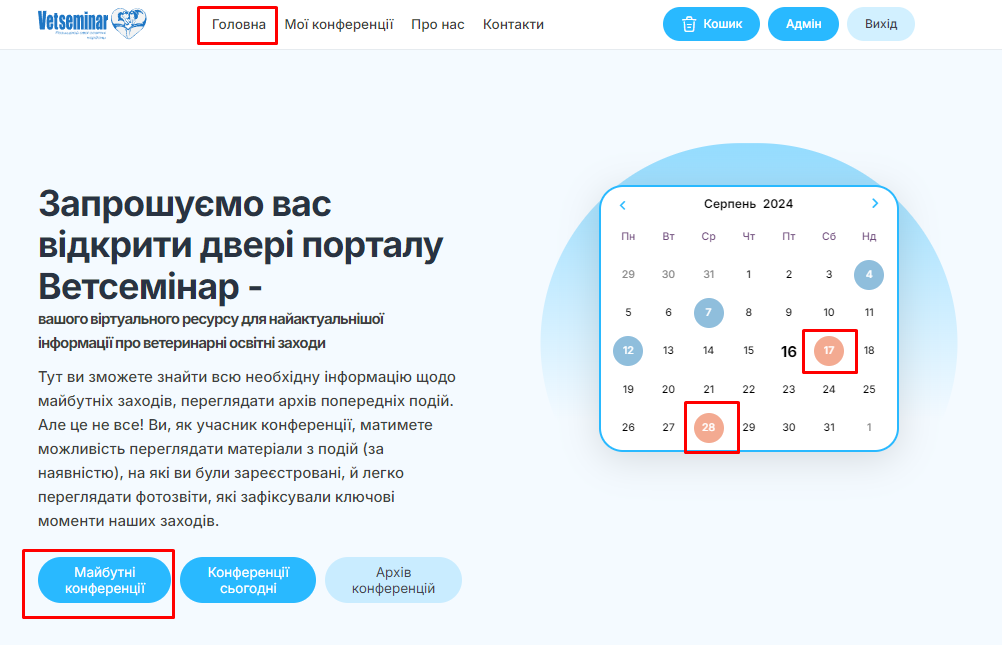 Щоб переглянути список найближчих конференцій, відвідайте головну сторінку сайту: vetseminar.academy. Натисніть кнопку «Майбутні конференції» або скористайтеся календарем, де дати майбутніх подій позначені рожевим кольором. Клікнувши на обрану дату, ви зможете дізнатися, яка подія відбудеться цього дня.
