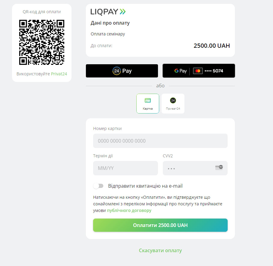 У разі оплати послуг на сайті, в момент оформлення замовлення (успішного введення платіжних реквізитів у фрейм платіжної системи LiqPay) відбувається разове списання суми вартості замовлених послуг. Валюта платежу - українська гривня (UAH)
